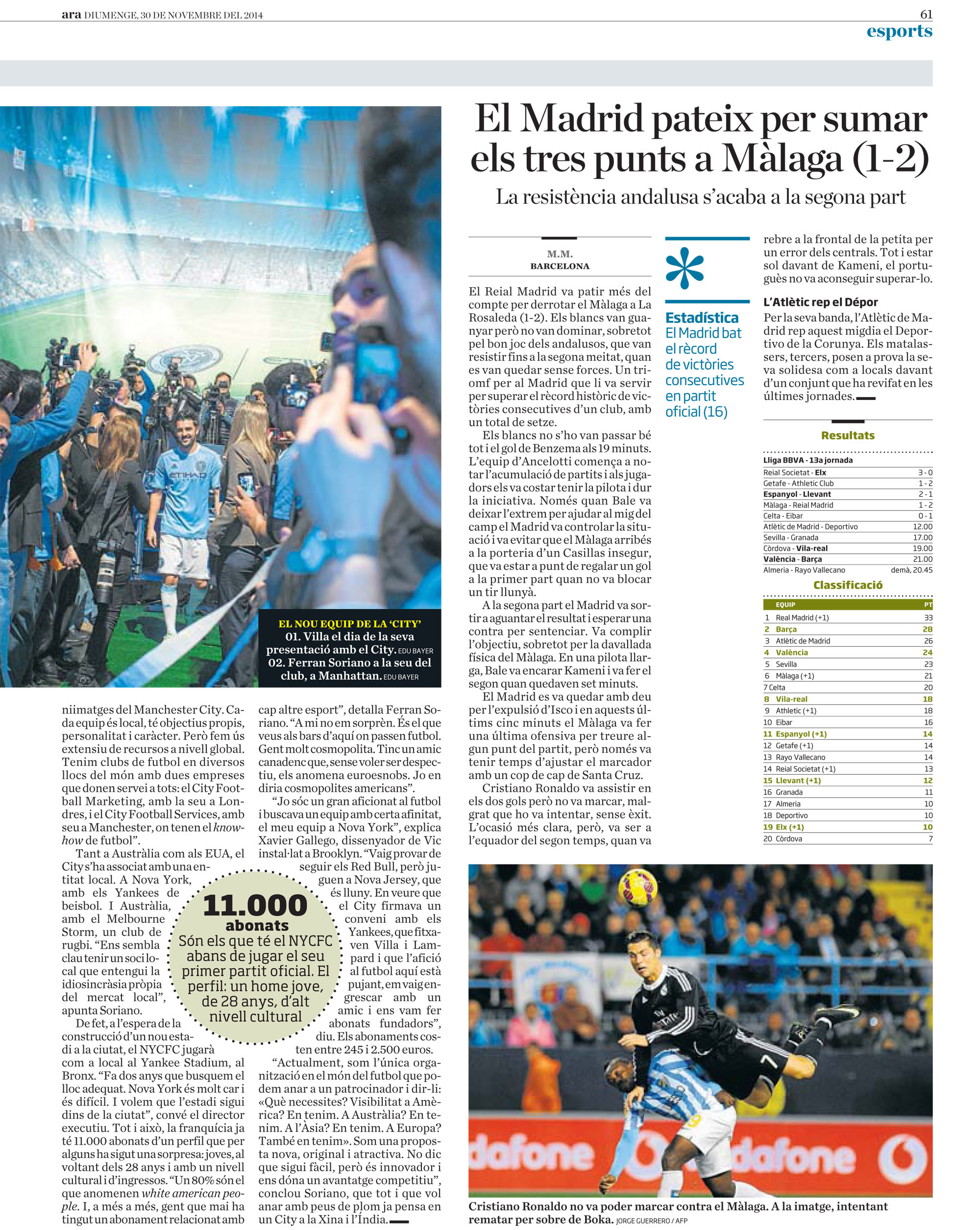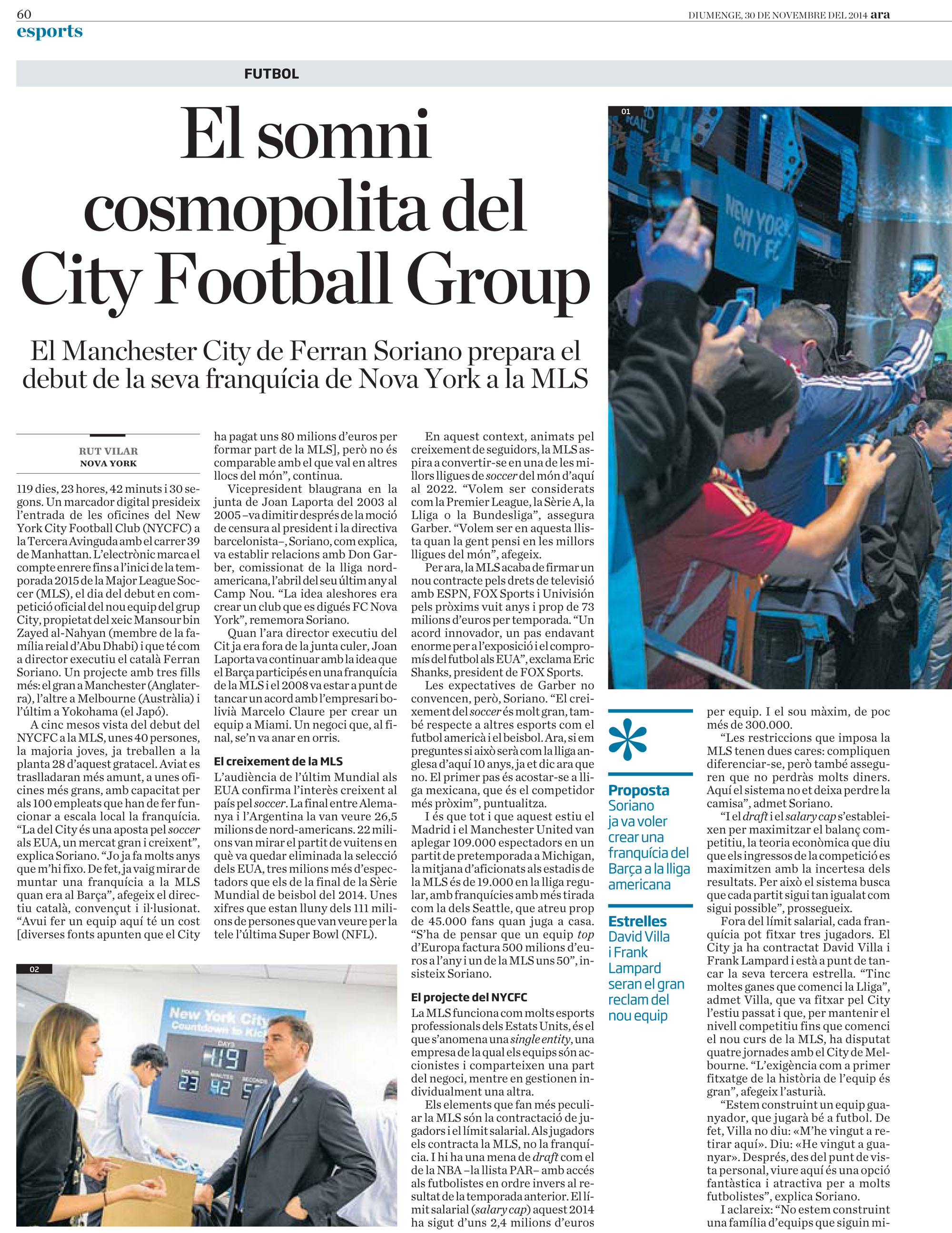 “Actualment, som l’única organització en el món del futbol que podem anar a un patrocinador i dir-li: què necessites? Visibilitat a Amèrica? En tenim. A Austràlia? En tenim. A Àsia? en tenim. A Europa? També en tenim. Som una proposta nova, original i atractiva. No dic que sigui fàcil, però és innovador i ens dóna un avantatge competitiu”, conclou Soriano que tot i que vol anar amb peus de plom ja pensa en un City a la Xina i l’Índia.